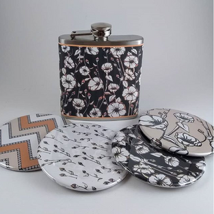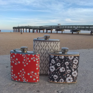 When we were in Philadelphia I started putting my textile prints on some flasks. We did a couple of craft shows and did really well. We found it was something people liked and it was affordable. We added pocket mirrors and coasters to the product list and are thinking of other products we can do that aren’t saturated in the market. I call it functional art that you can carry with you. I want people to have something that is not the same as everyone else and at an affordable price point.